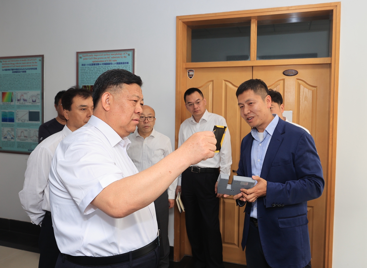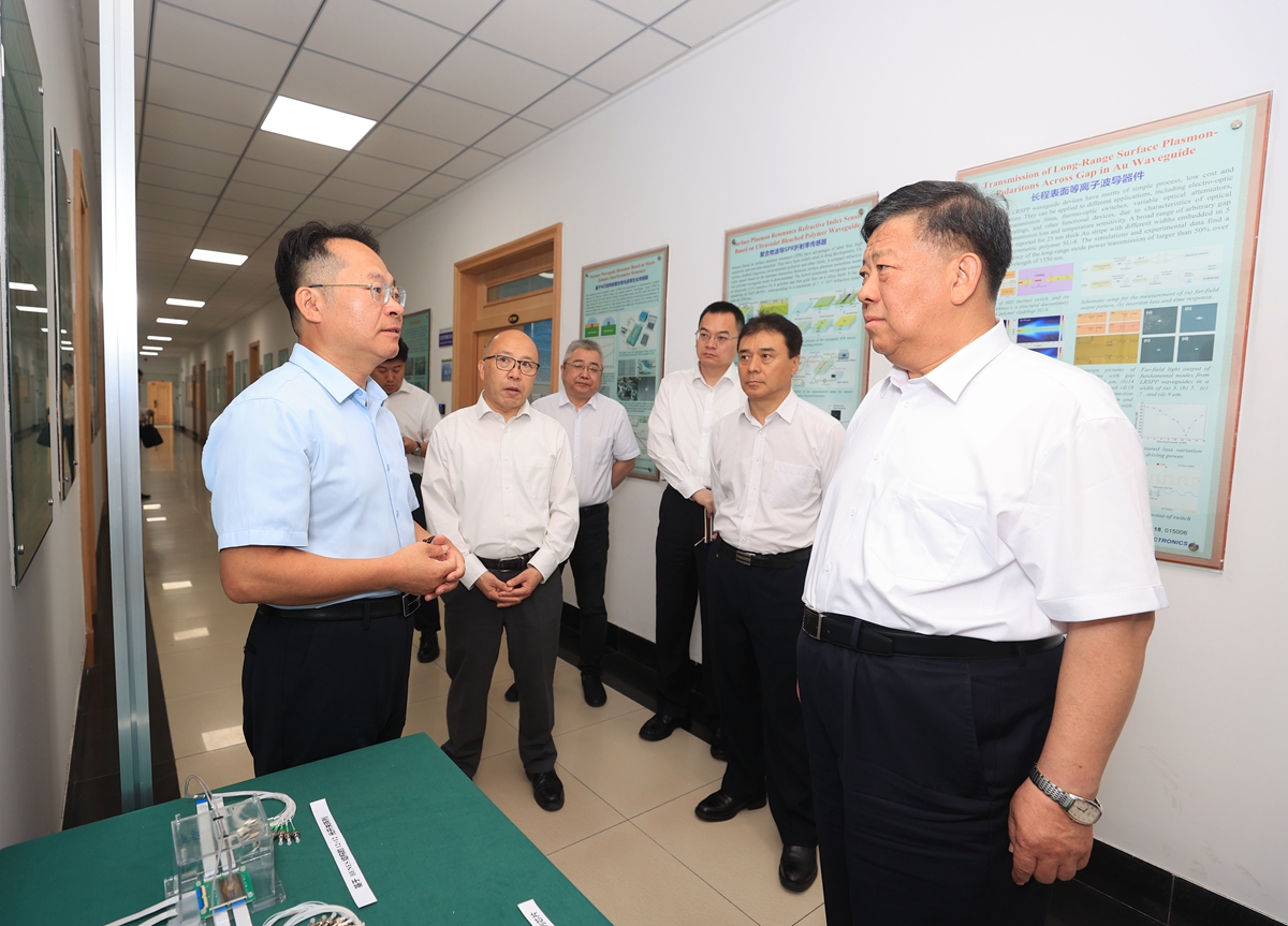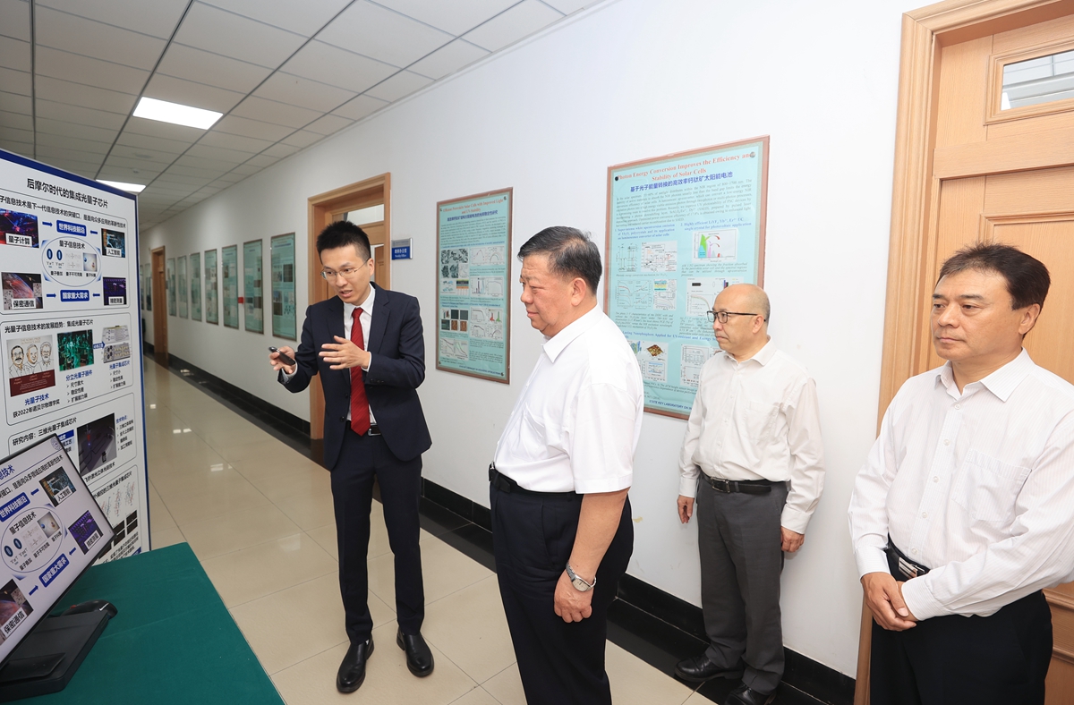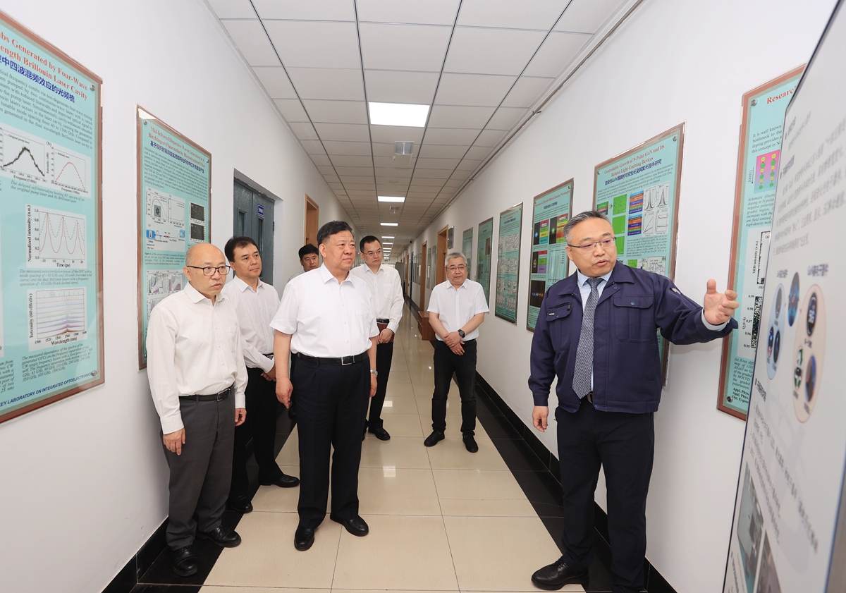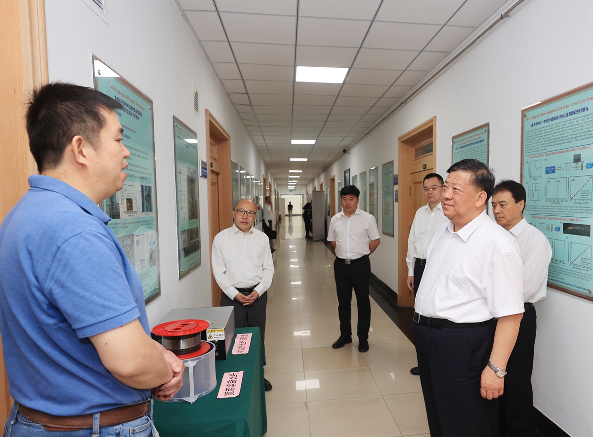 随后,姜治莹实地考察了超快光电技术实验室、宽禁带半导体材料与器件实验室、红外玻璃光纤与器件实验室、红外纳米光电子实验室、集成光路实验室、光伏器件制作超净实验室、固态激光雷达实验室、先进光电子实验室,详细了解各实验室在科学研究、成果转化、人才培养、国际合作及师资队伍建设等方面取得的最新进展,勉励大家主动融入国家创新体系建设,持之以恒加强基础研究,夯实科技自立自强根基,努力以原始创新成果服务教育强国建设。