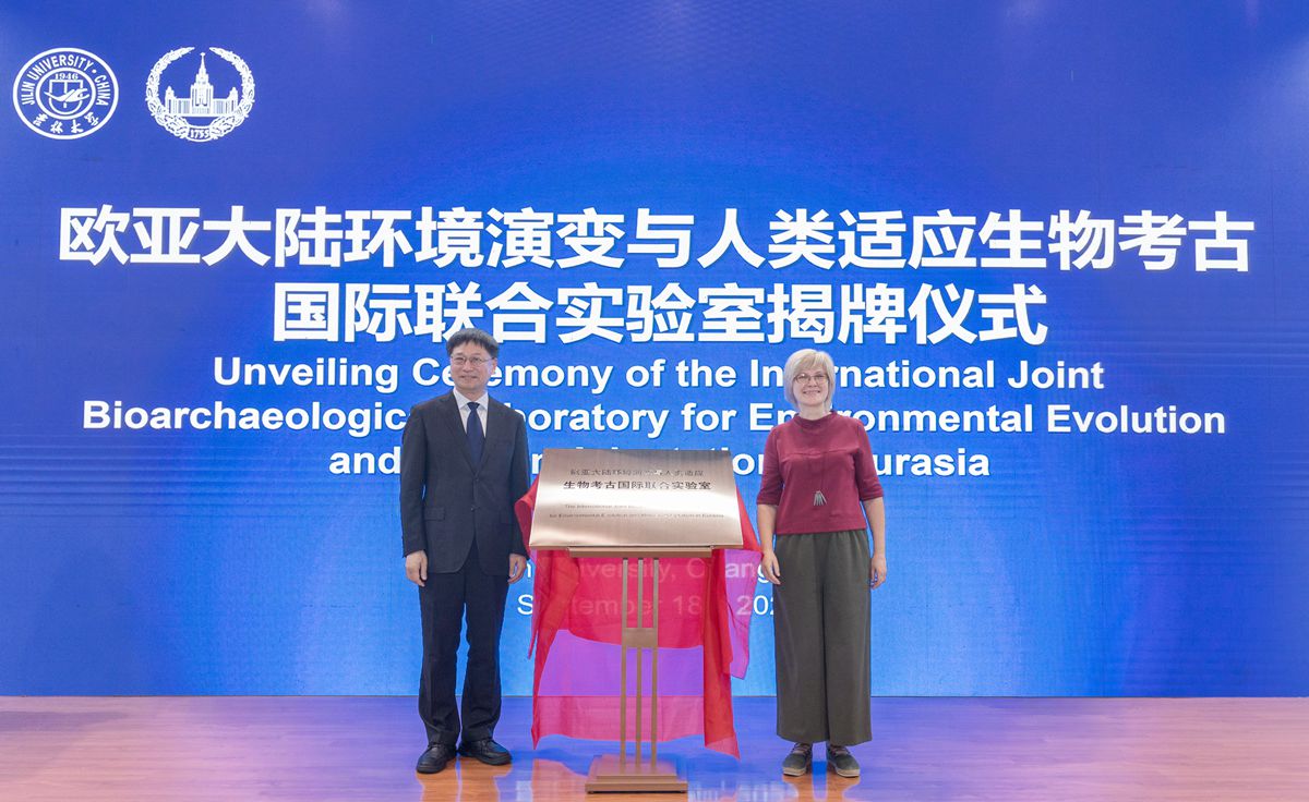校长、中国科学院院士张希出席揭牌仪式,并与俄罗斯莫斯科国立大学人类学研究所所长、人类学博物馆馆长,俄罗斯科学院院士布日洛娃·阿列克桑德拉共同为欧亚大陆环境演变与人类适应生物考古国际联合实验室揭牌。
